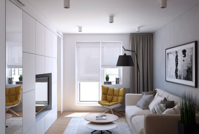 Потрясающий интерьер однокомнатной квартиры с белыми стенами, которые создают иллюзию свободы, стильным стеллажом с гладким фасадом, небольшим раскладным диваном цвета слоновой кости, круглым журнальным столиком, мягким желтым креслом и умеренным количеством грамотно подобранного декора в виде черно-белой картины, торшера, диванных подушек и живых растений, которые делают интерьер уютным и интересным.